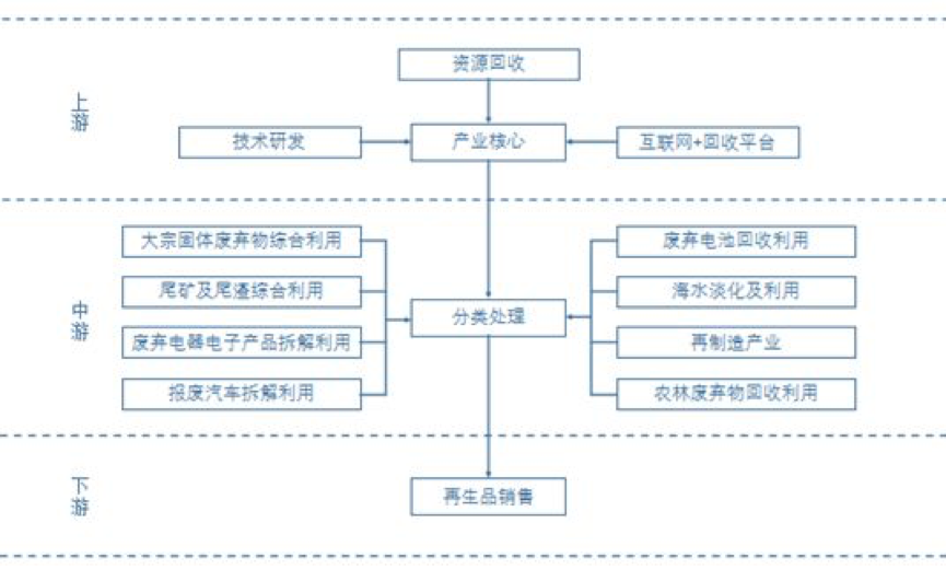 资源循环利用产业包含较多环节,上游主要是研发和各类资源回收,中游环节则针对不同的资源分类循环利用,涵盖了大宗固体废弃物综合利用、尾矿及尾渣综合利用、废弃电器电子产品拆解利用等,下游则是再生产品的应用及销售。