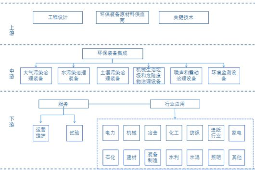 随着全球环境问题的逐渐显现,中国政府对环保事业的重视程度得到不断提高,环保机械制造业得到政府的大力支持,中国环保设备行业才得以快速发展。目前,中国环保设备行业整体上正在从成长期迈入成熟期。其产业链上游主要是研发设计、核心零部件供应商、关键技术研发等;中游环节则是针对大气、水、土壤等环境污染进行治理的环保设备制造以及环境监测设备制造;下游环节则是环保装备的服务与应用。