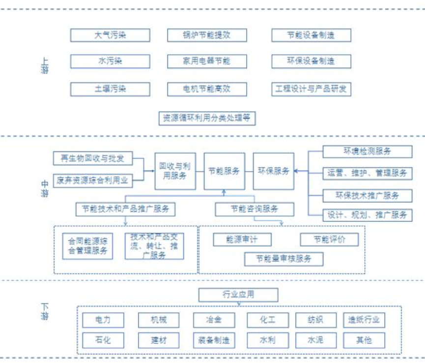 节能环保服务业是节能环保产业中的重要领域之一,其上游主要是节能与环保需求以及装备制造等,中游环节则是针对不同的节能环保问题的综合性处理以及节能环保装备、技术的推广,涵盖了节能咨询服务、节能技术与产品推广服务、环境监测服务、环境咨询服务以及资源环境利用等,下游则是节能环保服务与行业应用。
