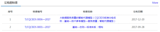 2017年下半年,重庆市云计算和大数据产业协会标准化技术委员会(以下简称“协会标委会”)在全国团体标准信息平台上正式发布了两项团体标准,分别是9月28日发布的“大数据标准体系基础框架”(编号:T/CQCBDS 0001 2017)、12月20日发布的“大数据服务质量的智能代理模型”(编号:T/CQCBDS 0006 2017)。该两项团体标准由重庆邮电大学、重庆云威科技有限公司、重庆西南集成电路有限公司等单位联合研究制定。