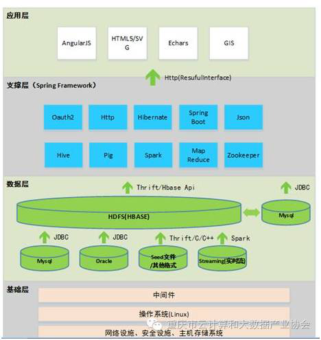本平台系统架构概括为“四层架构、二大体系”。其中四层架构自顶向下为应用层、支撑层、数据层、基础层。两大体系包括技术接口规范和运维管理制度本方案总体架构如下图所示: