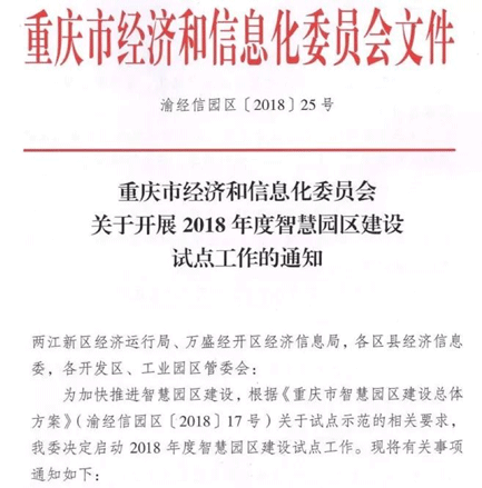 为加快推进智慧园区建设,2018年7月,市经济信息委印发了《重庆市智慧园区建设总体方案》(渝经信园区〔2018〕17号),明确了开展智慧园区建设试点,坚持试点先行,分年度在全市遴选一批产业基础较好、管理服务规范的园区进行试点。在满足智慧园区基本功能需求的基础上,进一步拓展智慧园区建设内容,创新智慧园区建设运营模式,打造一批特色突出、水平领先的智慧园区样板,为后续全面启动智慧园区建设,实现全市园区全覆盖起到示范带头作用。