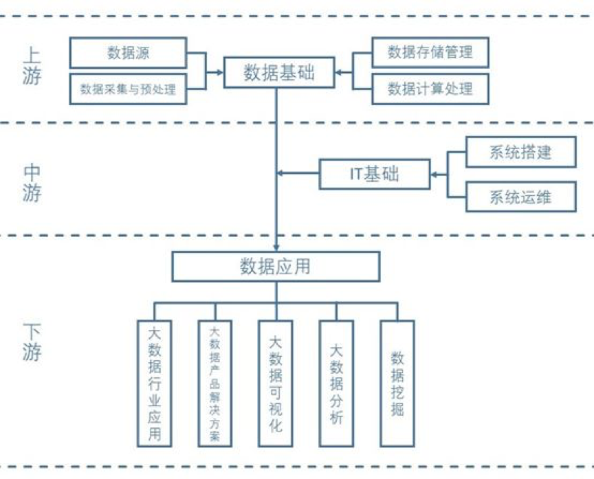 大数据产业链包括数据基础、IT基础、数据安全、数据应用。IT基础包括系统搭建、系统运维。数据基础包括数据源、数据采集与预处理、数据存储管理、数据计算处理。数据应用包括大数据行业应用、大数据产品解决方案、大数据可视化、大数据分析与数据挖掘。